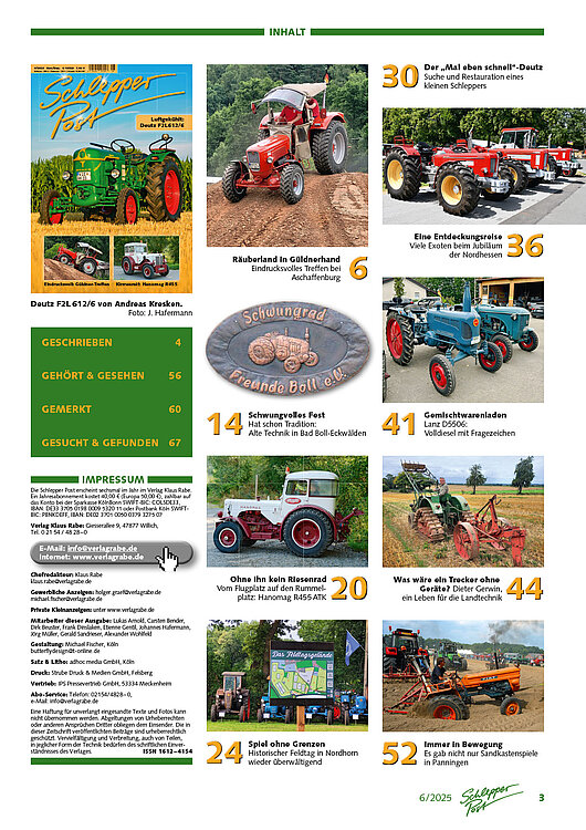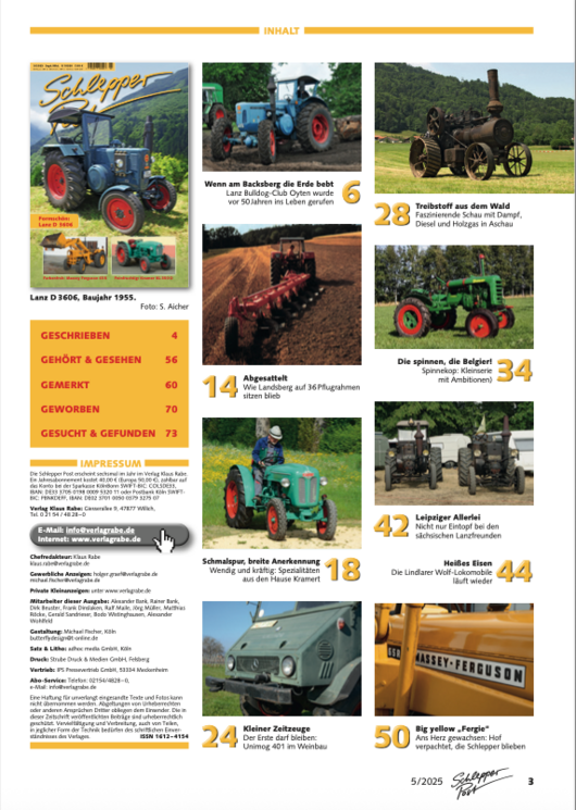 Die historischen Landmaschinen sind längst raus aus der Nische des Hobbys für belächelte, skurrile Zeitgenossen, die verbogenes Blech horten. Der alte Traktor ist zum Fortbewegungsmittel für den Freizeitausflug, zum Arbeitsgerät für Garten und Grundstück und zum Schau-Stück auf unzähligen, bestens besuchten Treffen geworden. Und wir dürfen ganz bescheiden behaupten, dass die Schlepper Post ihren Teil dazu beigetragen hat: Schließlich haben wir die immer größer werdende Alt-Traktor-Szene seit 1992 begleitet. Wir haben erlebt, wie das Hobby vielseitiger wurde, wie immer exotischere Marken gesammelt und damit am Leben gehalten wurden und wie die Szene so weit wuchs, dass die Gipfeltreffen mehrere 10.000 Besucher anlocken und niemand mehr beim Ausflug mit dem Porsche, dem Hanomag oder dem Fendt wie ein Exot bestaunt wird. Wir sind stolz, Teil dieser Szene zu sein und unterstützen Sammler und Freizeit-Landwirte mit Restaurierberichten, Darstellungen von Firmen-Geschichten, Sammler-Portraits, Treffen-Berichten, Terminübersichten und einem großen Kleinanzeigenteil!